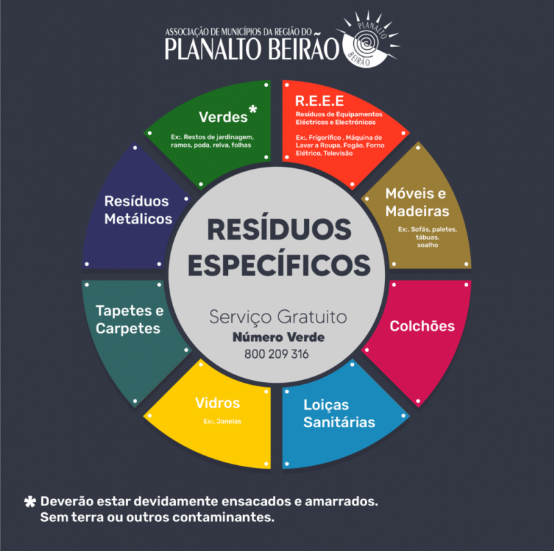 A Associação de Municípios da Região do Planalto Beirão tem ao seu dispor, um serviço gratuito de recolha porta-a-porta de resíduos específicos, que devido ao seu volume e composição não devem ser depositados nos contentores de RSU.